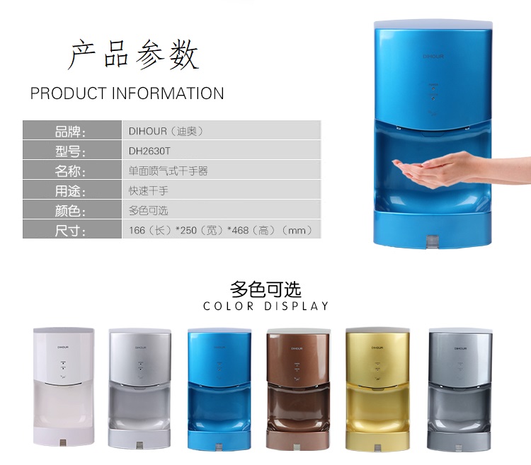 1、 干手机采用独特设计的高速马达,风速达每秒100米,配合温风功能7-10秒迅速干手。