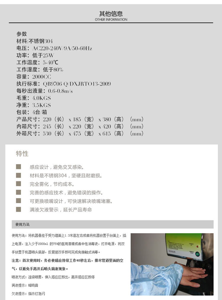 手消毒器(又称净手器)是国内唯一一款采用304不锈钢外壳的免接触式手消毒器,又称酒精喷雾器和自动净手器,该产品喷出的消毒液能达到完全雾化的效果,每秒喷出的液体仅为0.6到0.8毫升,避免了消毒液的浪费,同时该产品采用人性化设计,在液体加满的时候发出蜂鸣声提示,在液体即将没有的时候指示灯闪亮提醒用户加液,同时启动保护功能,避免水泵空转,延长使用寿命。该产品广泛用于制药厂、医院、食品厂、食品包装材料厂、化妆品厂、学校、餐厅、快餐店、银行等,是制药厂食品厂、食品包装材料厂、化妆品厂等通过HACCP认证、QS认证、GMP认证的好帮手。